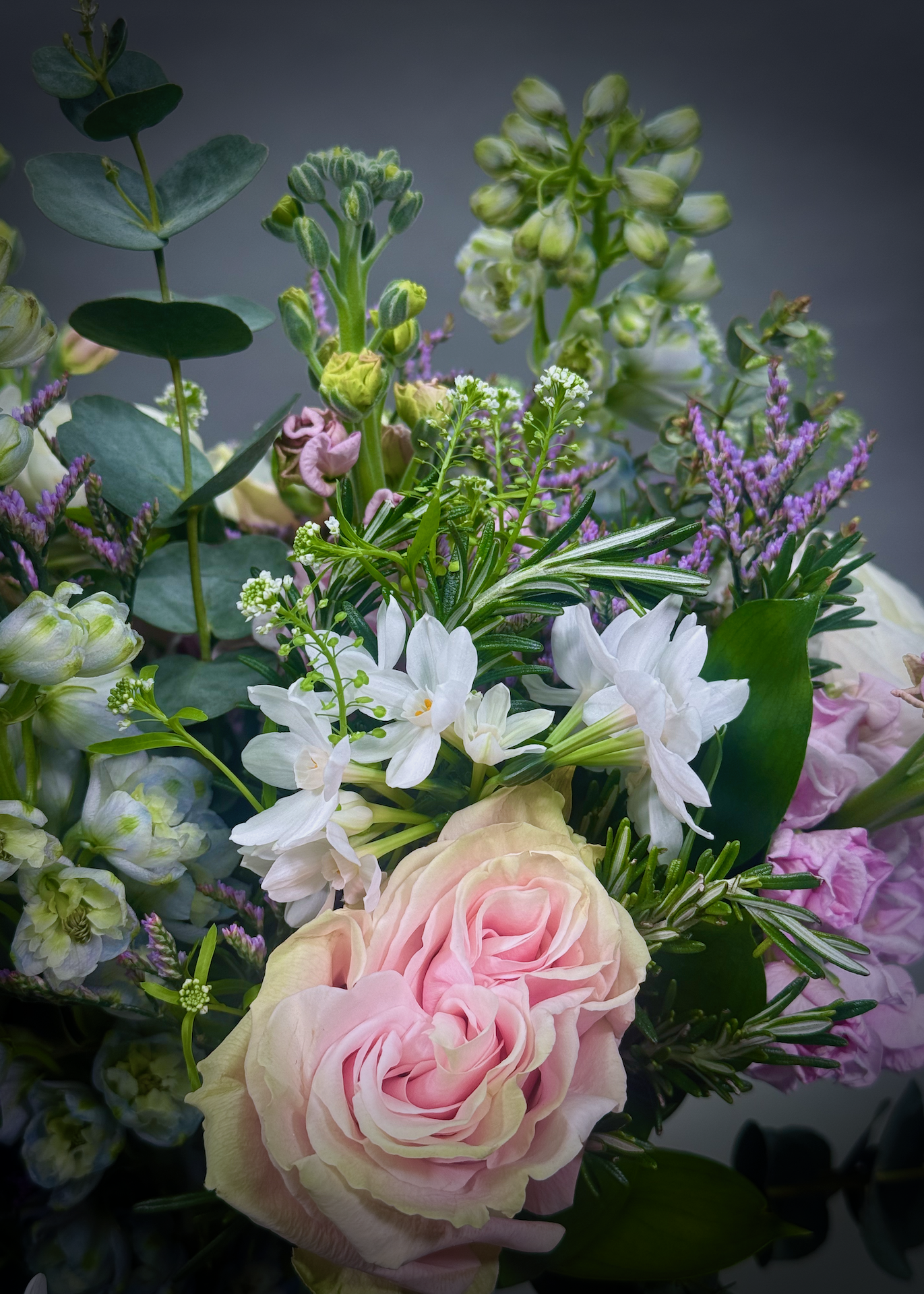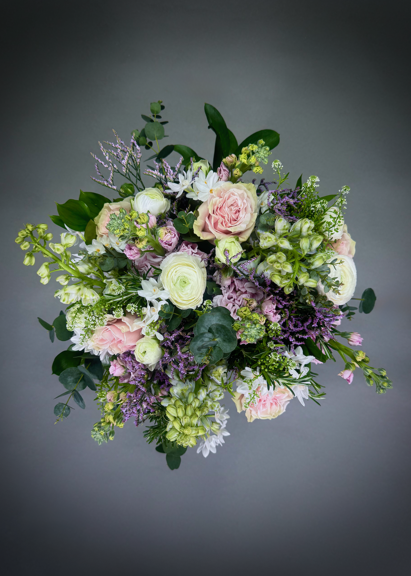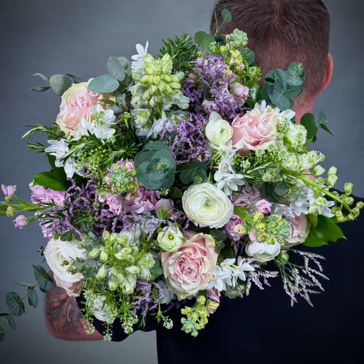Pastel Perfection. A dreamy Spring bouquet full of delphiniums, narcis, stocks, ranunculus, mondial roses, limonium mixed with seasonal foliages.