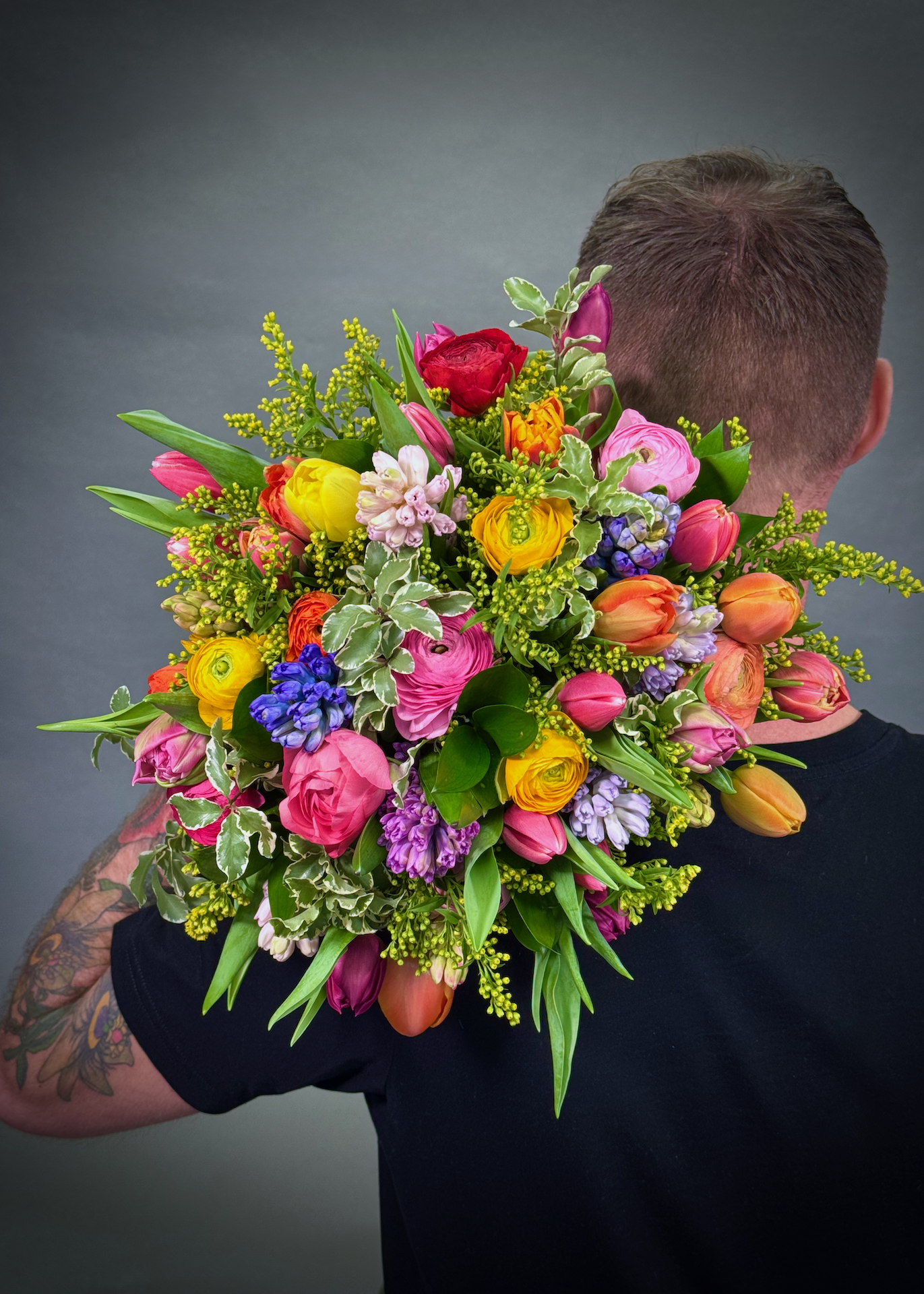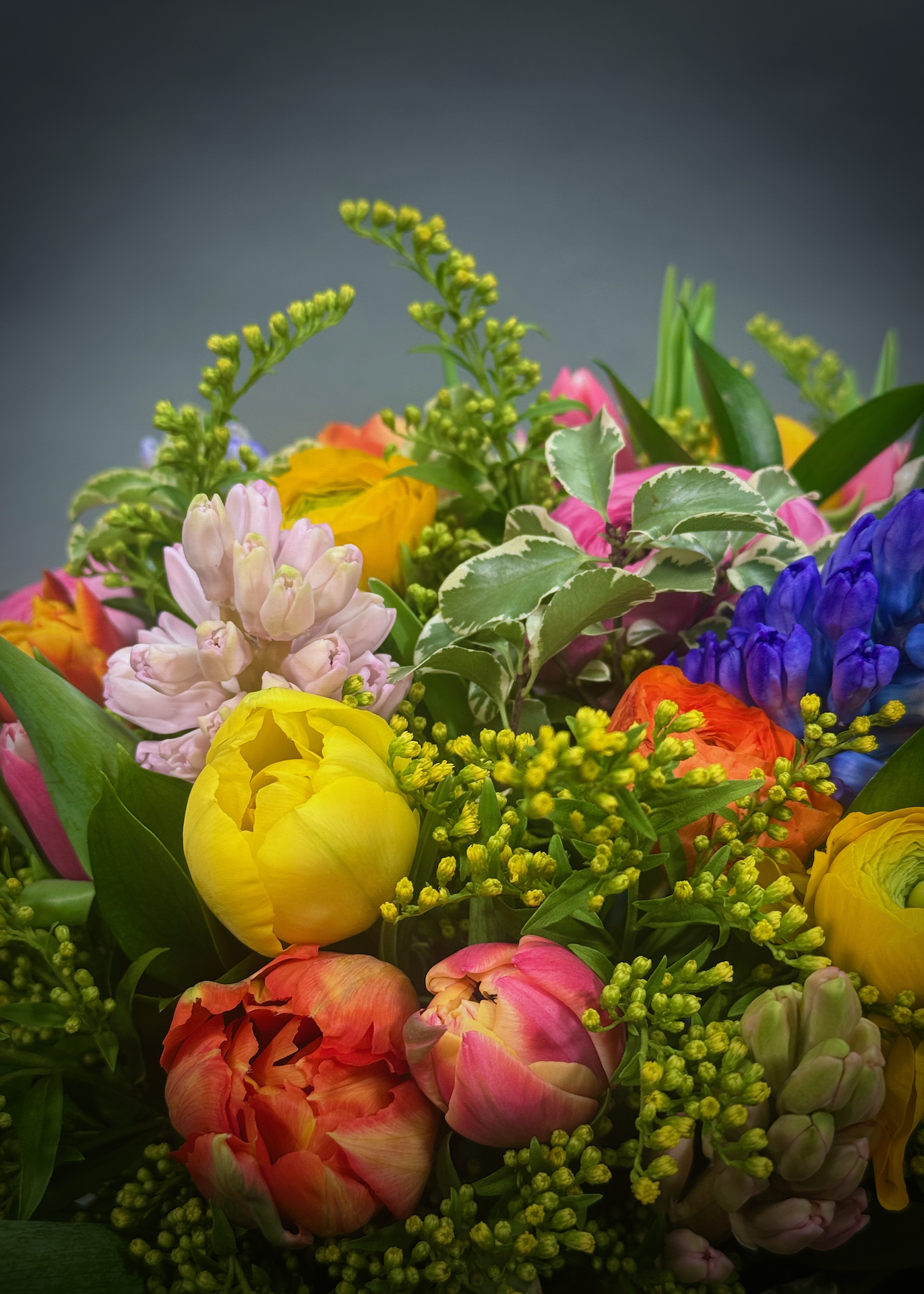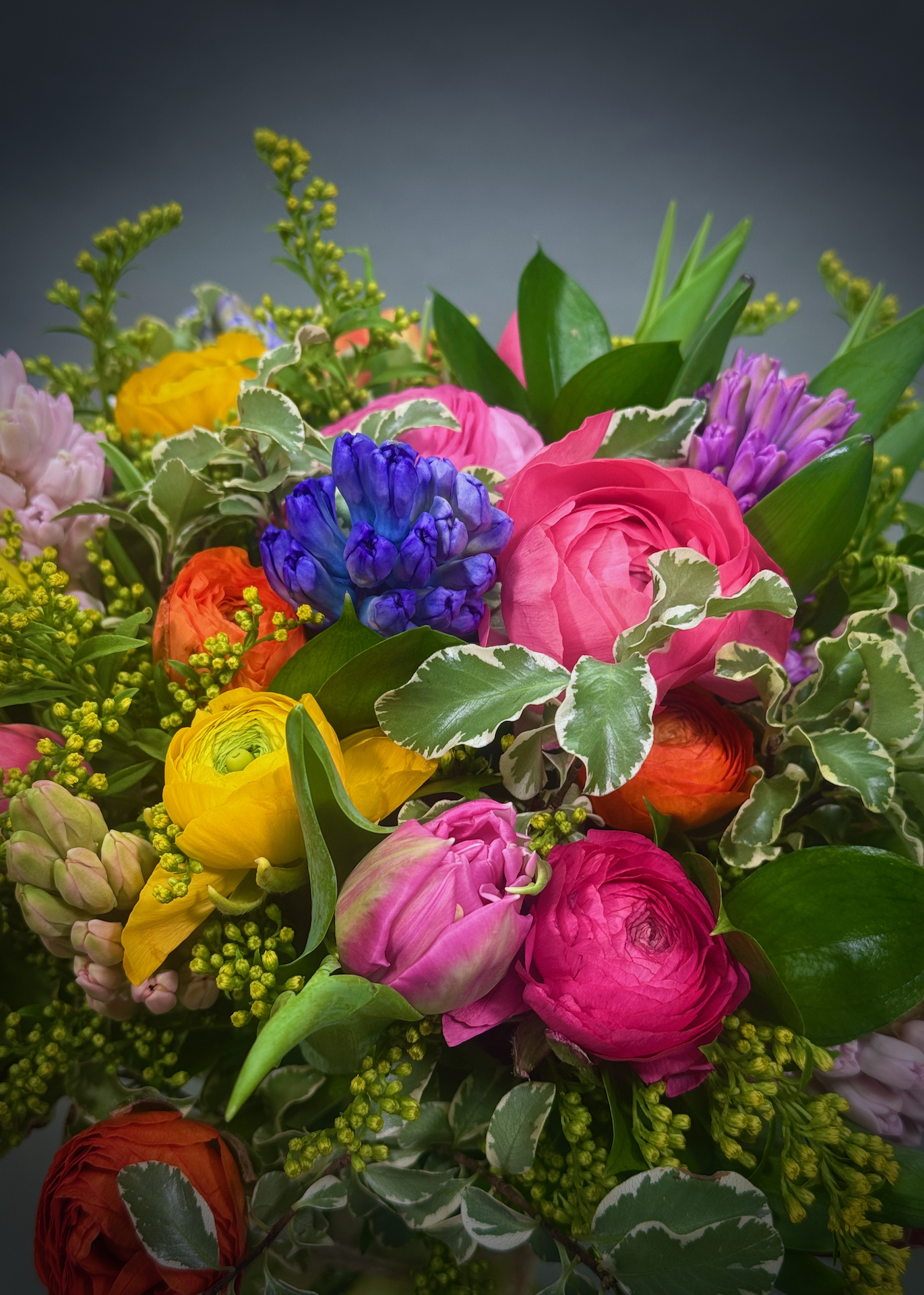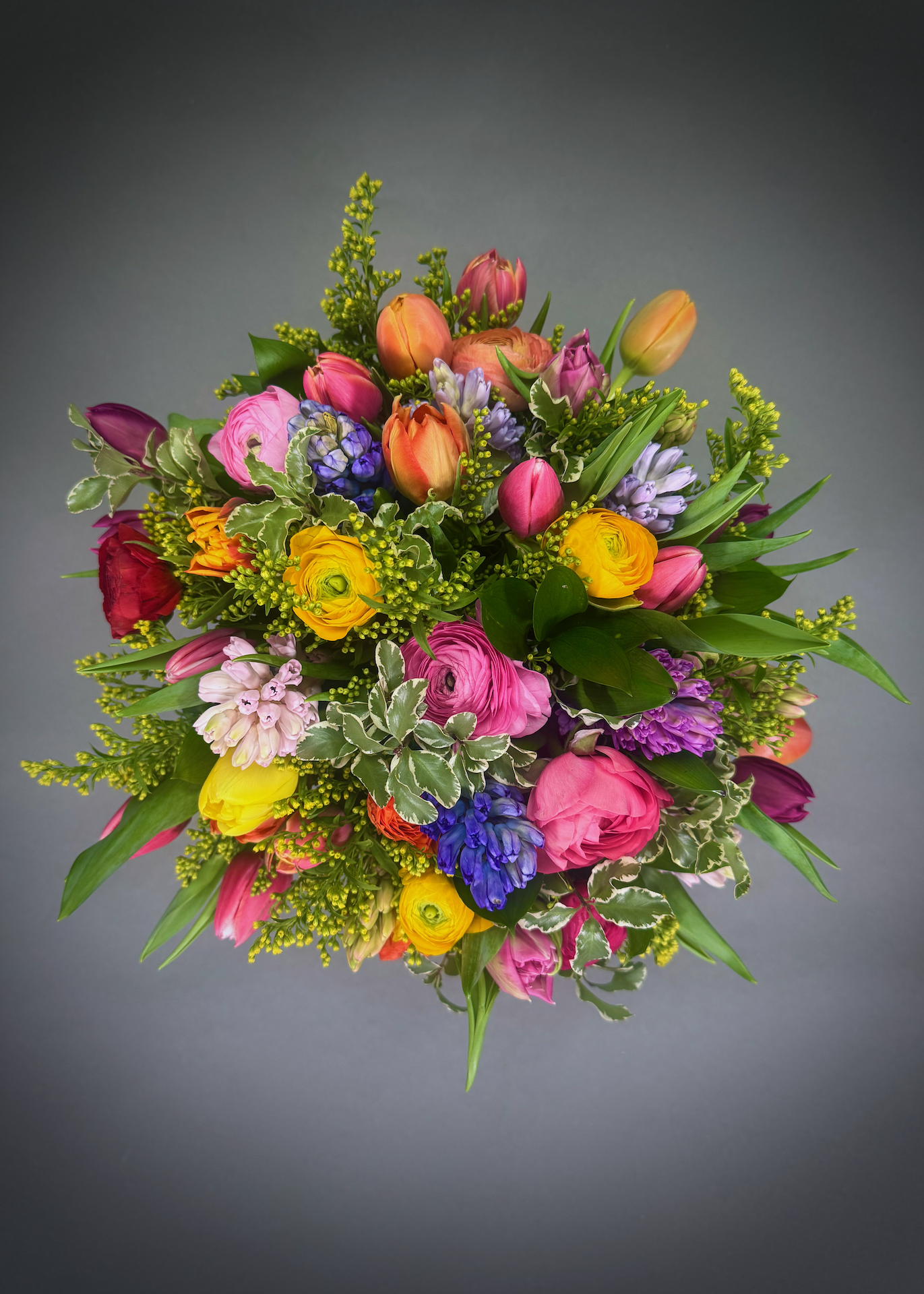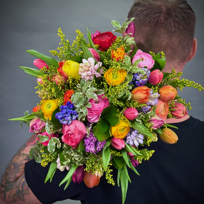 Our spring time bouquet is an abundance of colourful ranunculus, tulips, hyacinths nestled among solidago mixed with seasonal foliages