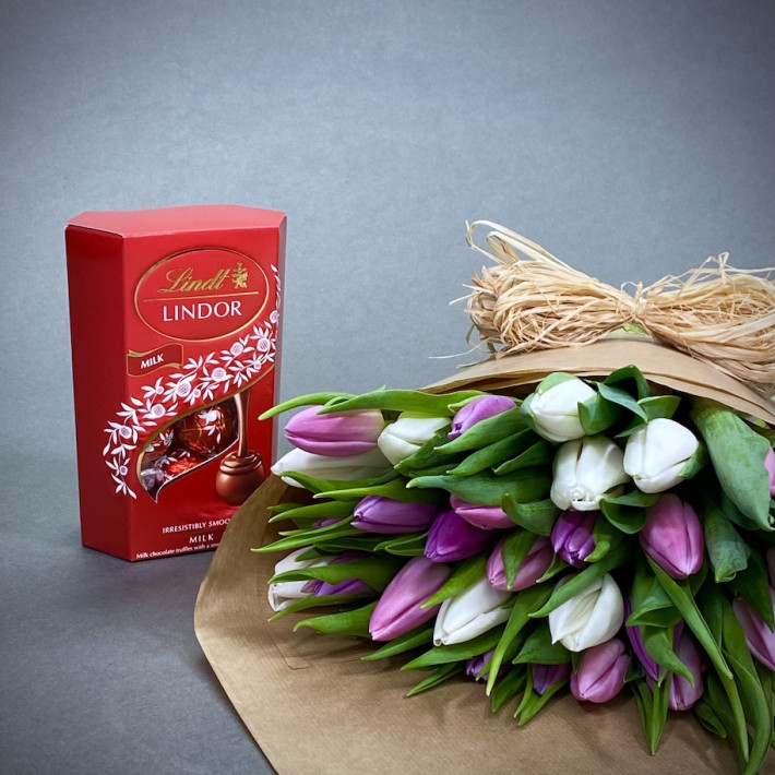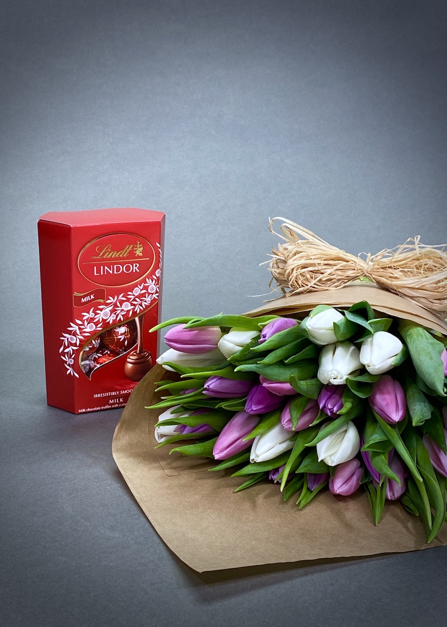 A lovely wrap of tulips in pale pinks, lilac’s and whites, this comes wrapped in brown paper with a raffia bow and Lindt Lindor Chocolates