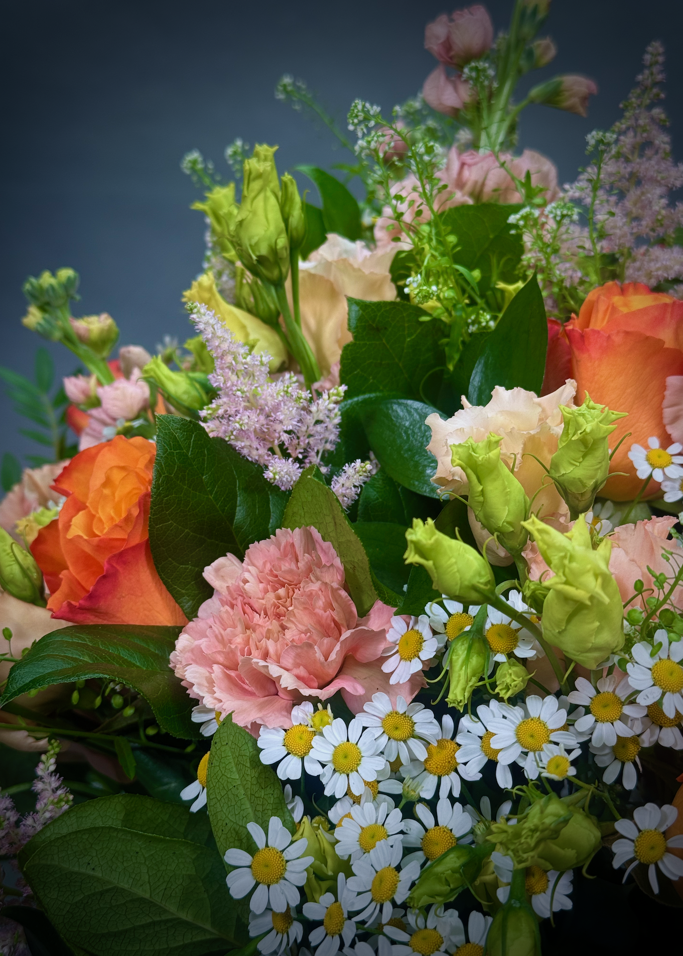 Indulge in the exquisite beauty of our Yew bouquet, Orange rose, peach eustoma, stocks, carnations, blush pink astilbe all nestled among tanacetum daisy mixed with seasonal foliages.