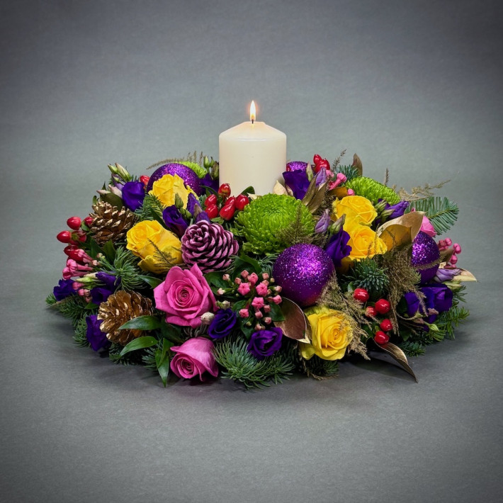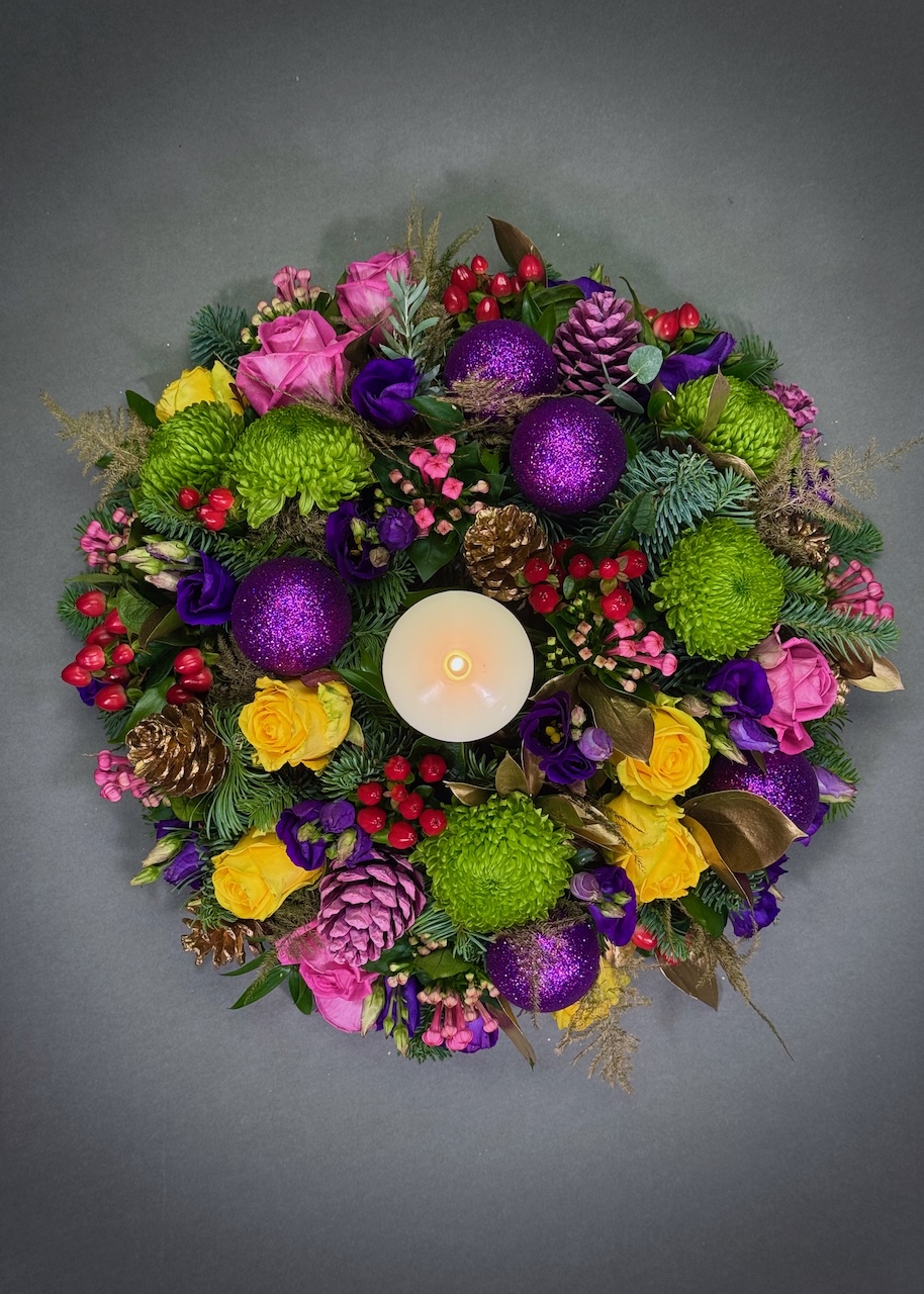 This Bright table centre includes Pink Rose’s, Red Hypericum Berry, Green Blooms, Yellow Rose’s, Purple Eustoma, Bright Pink Bouvardia, Purple glittery baubles, pink pine cones and gold foliages.