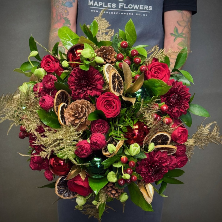 For that perfect festive finishing touch, we have added, Red and Dark Green Baubles, Natural Cones, Gold Asparagus Fern and natural dried fruits.