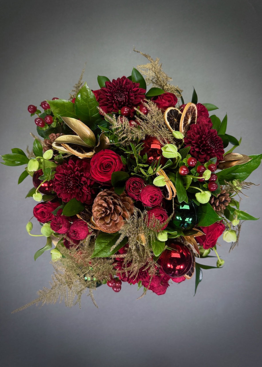 Make their Christmas magical with this beautifully festive arrangement of Red Rose’s, Red Spray Rose, Red Blooms, Red Hypericum Berry, Green Hellebores with an abundance of seasonal foliages