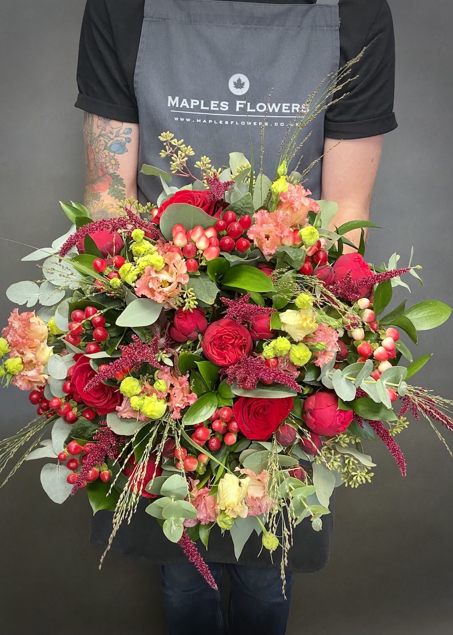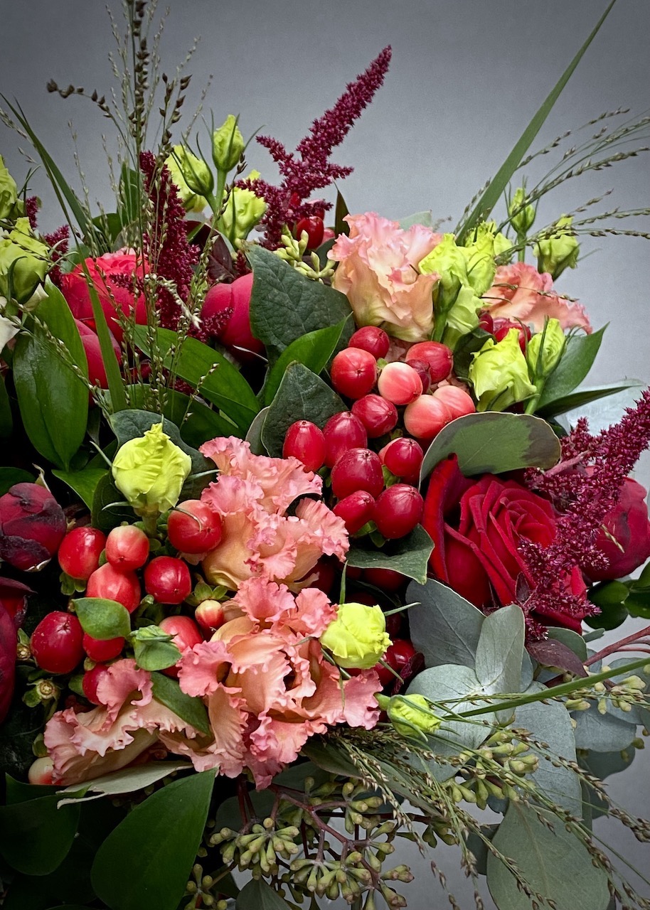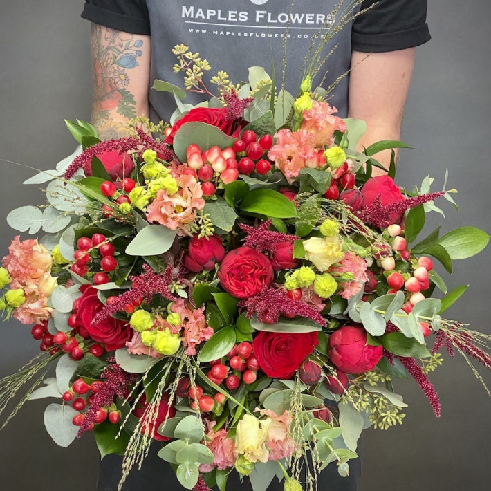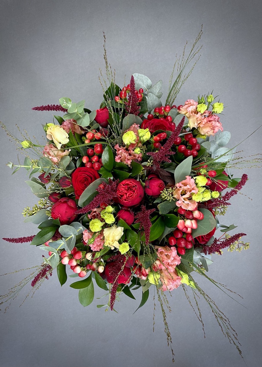 A rich mix of red roses, red spray rose, amaranthus, hypericum, eustoma with a lovely rich selection of foliages including eucalyptus and mixed grasses.