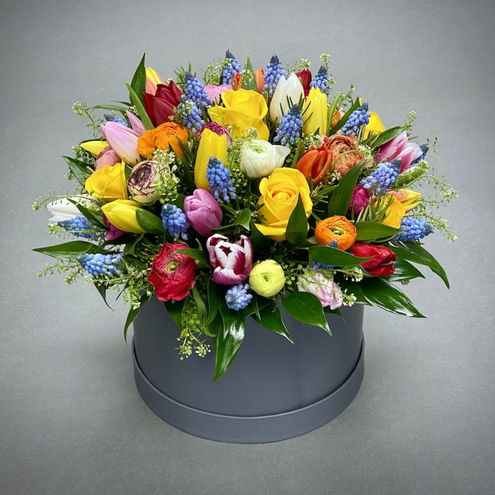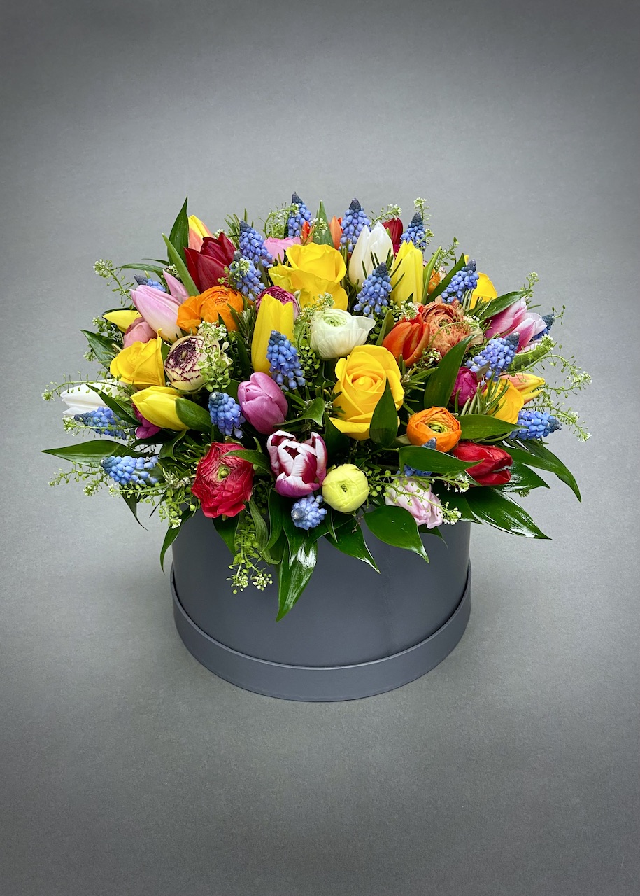 This bright, fun and vibrant hat box really does make a statement, created with yellow roses, mixed coloured ranunculus, blue mascari, mixed coloured tulips and a selection of foliages