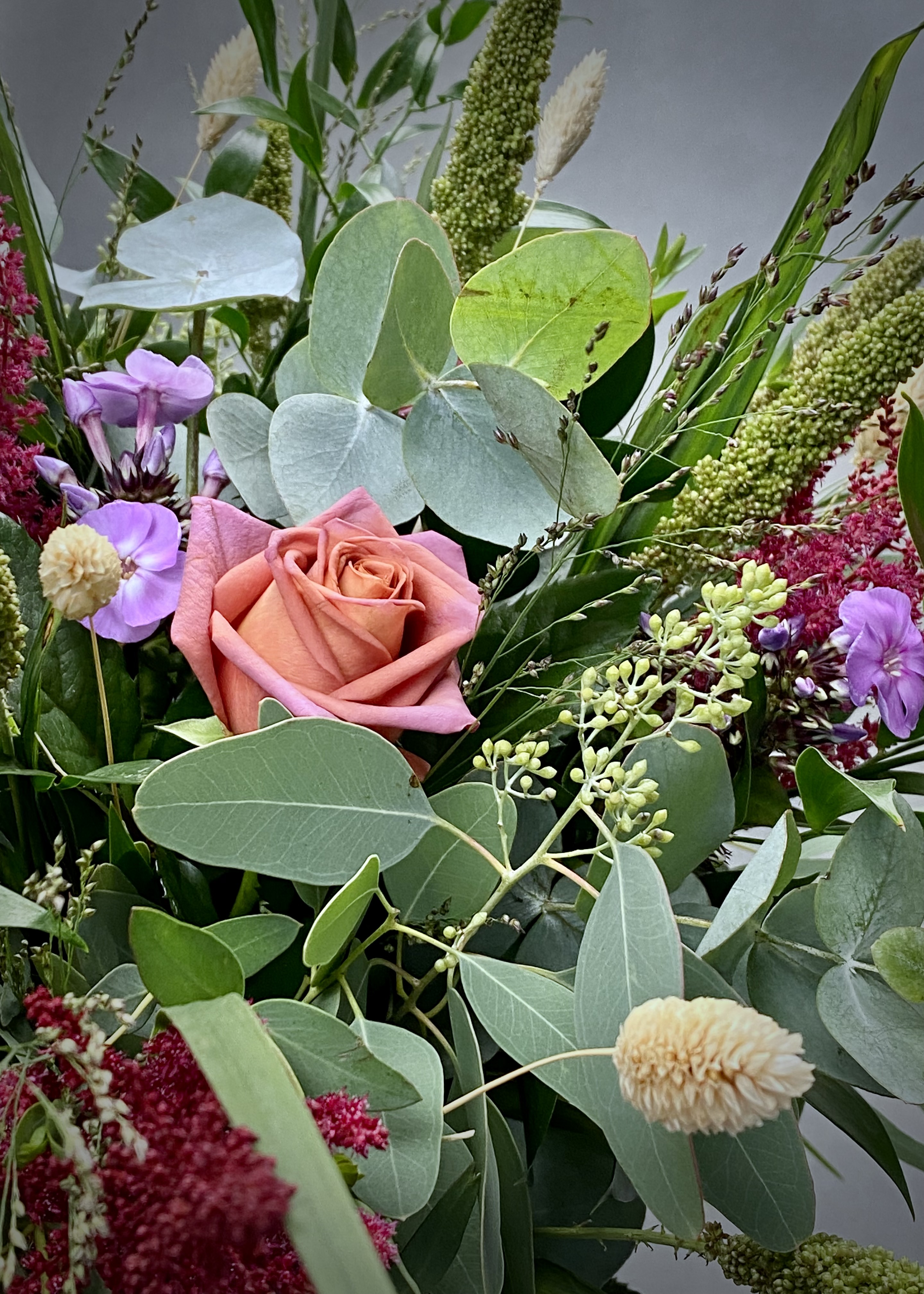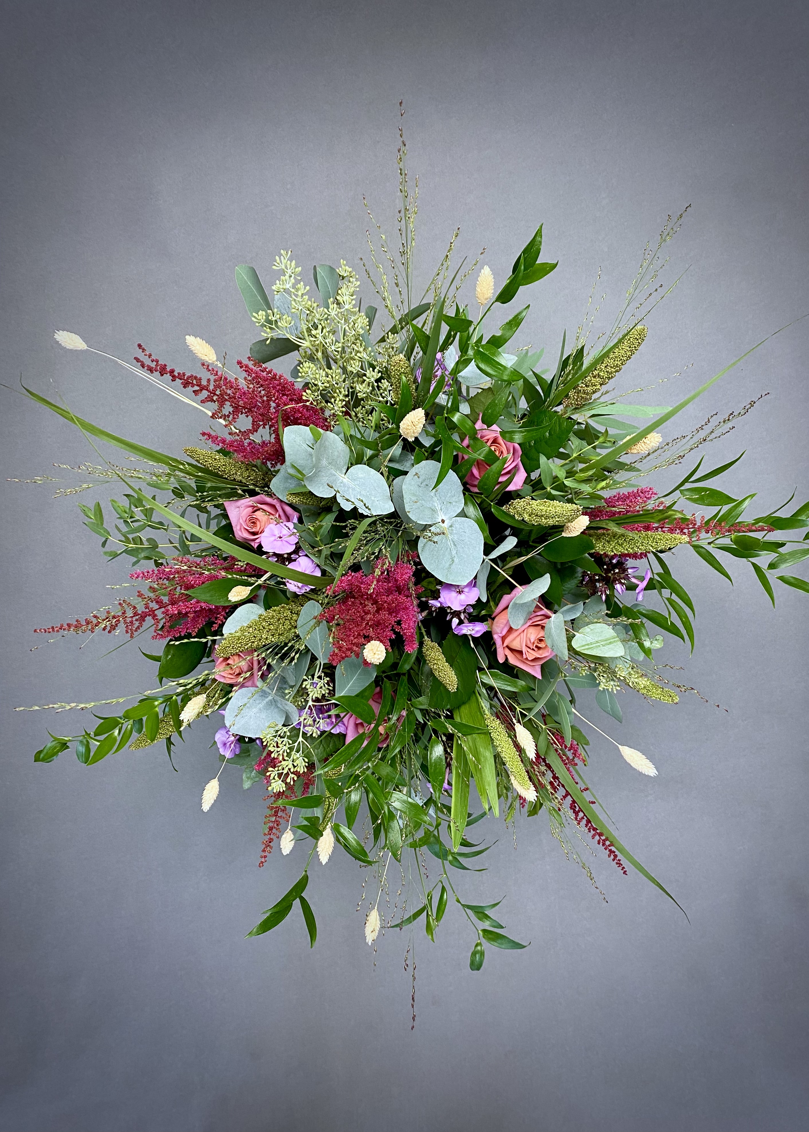 This soft and pretty bouquet is full of beautiful tones including barista roses, astilbe, phlox set against an interesting selection of foliages including fountain grass and dried grasses.