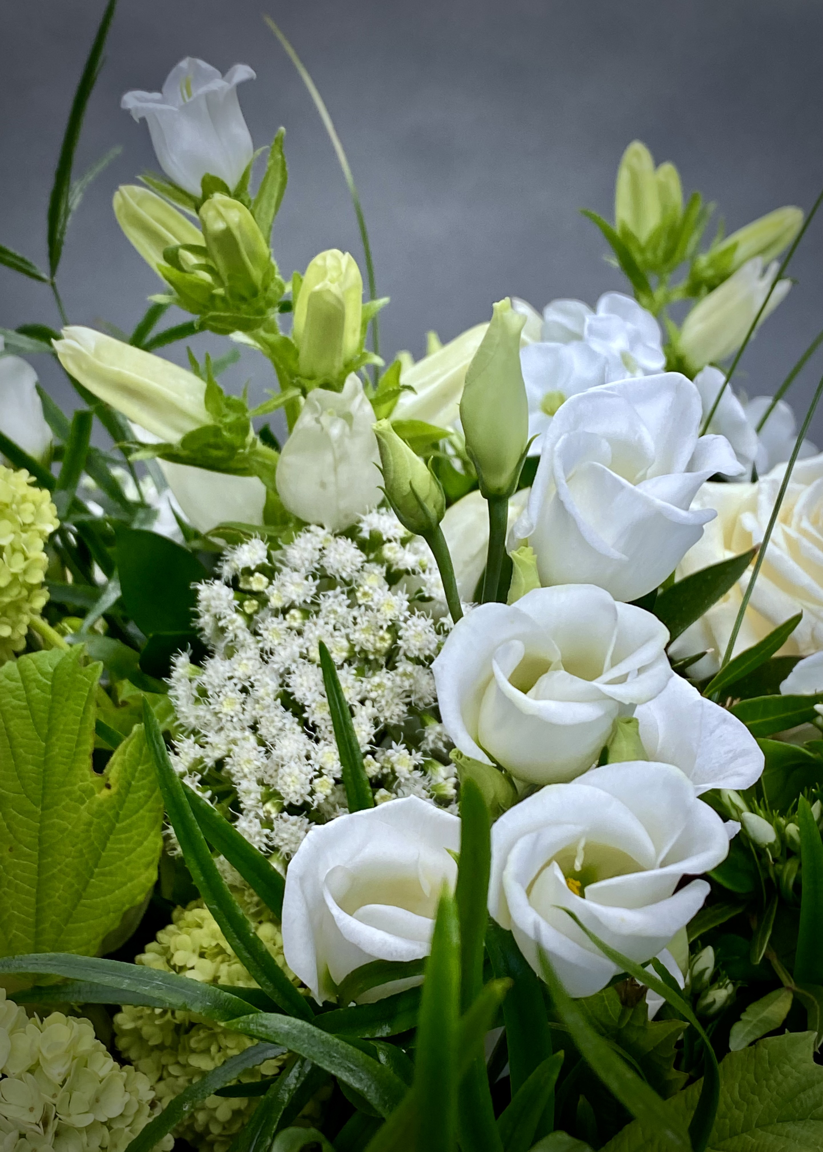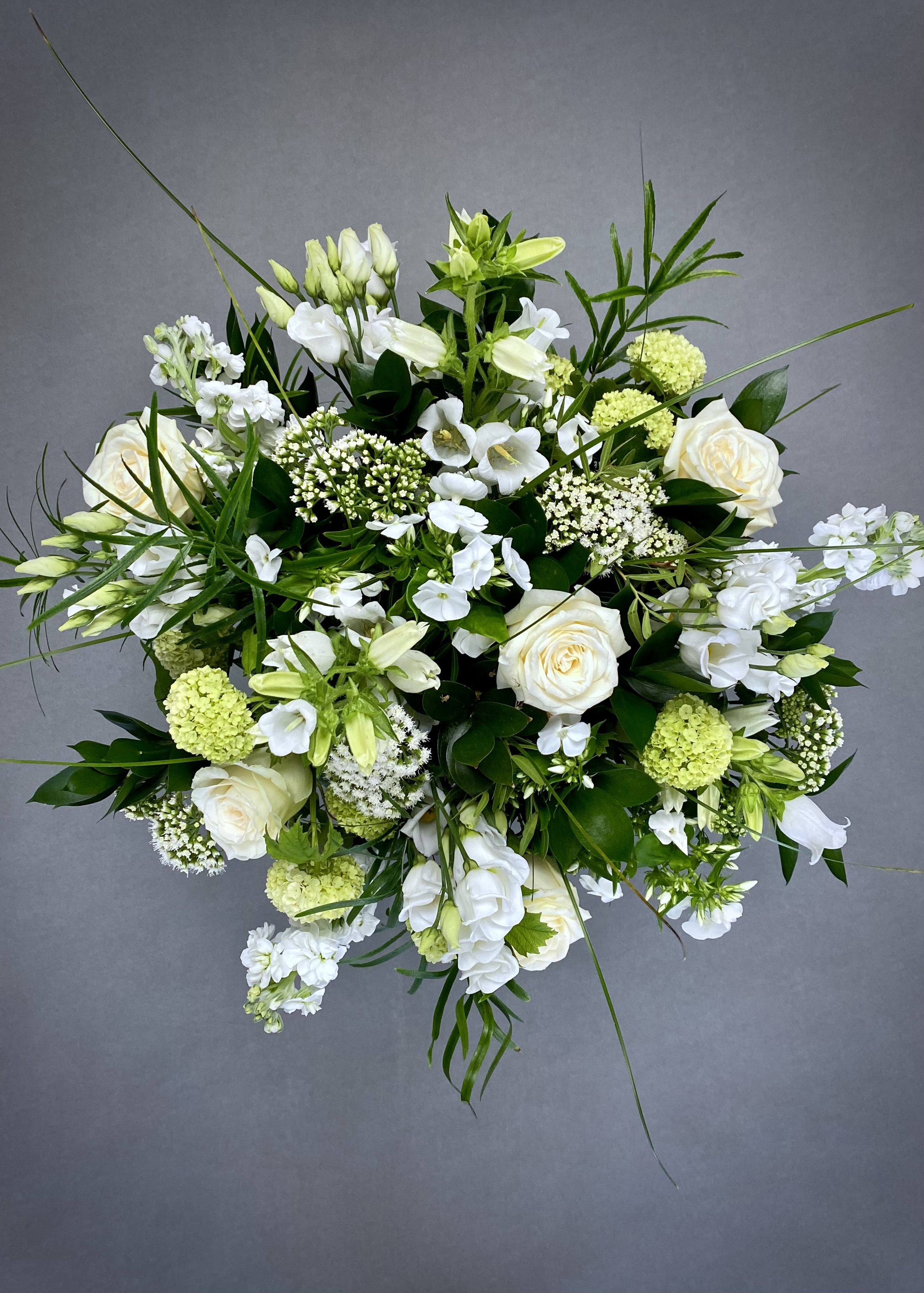 This timeless bouquet is full of elegant tones of ivory and white is a perfect gift. Made with roses, stocks, campanula , lisianthus, viburnum, phlox and eupatorium all set amongst a selection of seasonal foliage’s.