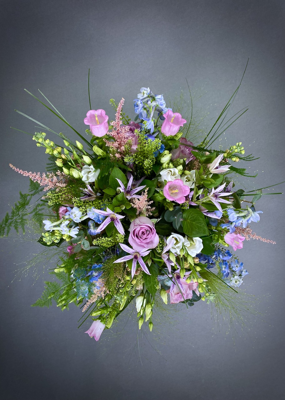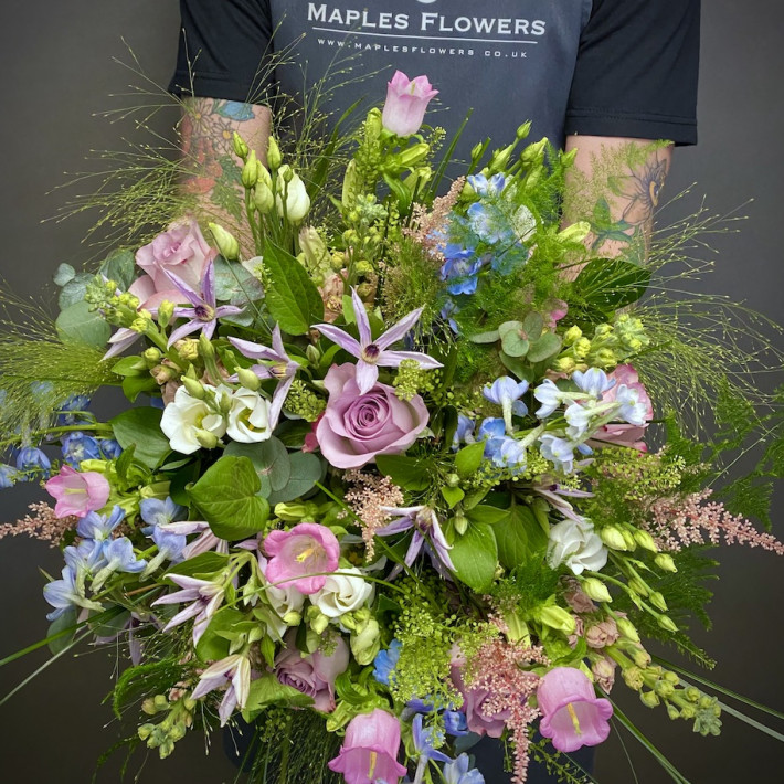 This timeless bouquet is full of elegant pastel tones for that perfect gift this Mothers Day. Our meadow themed bouquet is made with roses, stocks, campanula, lisianthus, astilbe, delphiniums all set amongst a selection of seasonal foliage’s
