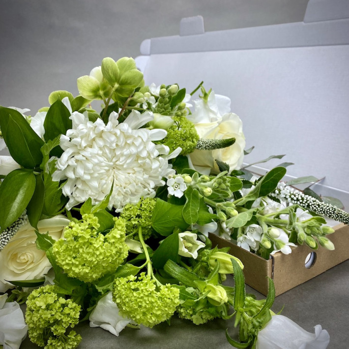 A florist choice selection of white and green flowers and foliage, safely packed into a letter box gift box ready to cut, arrange and enjoy.