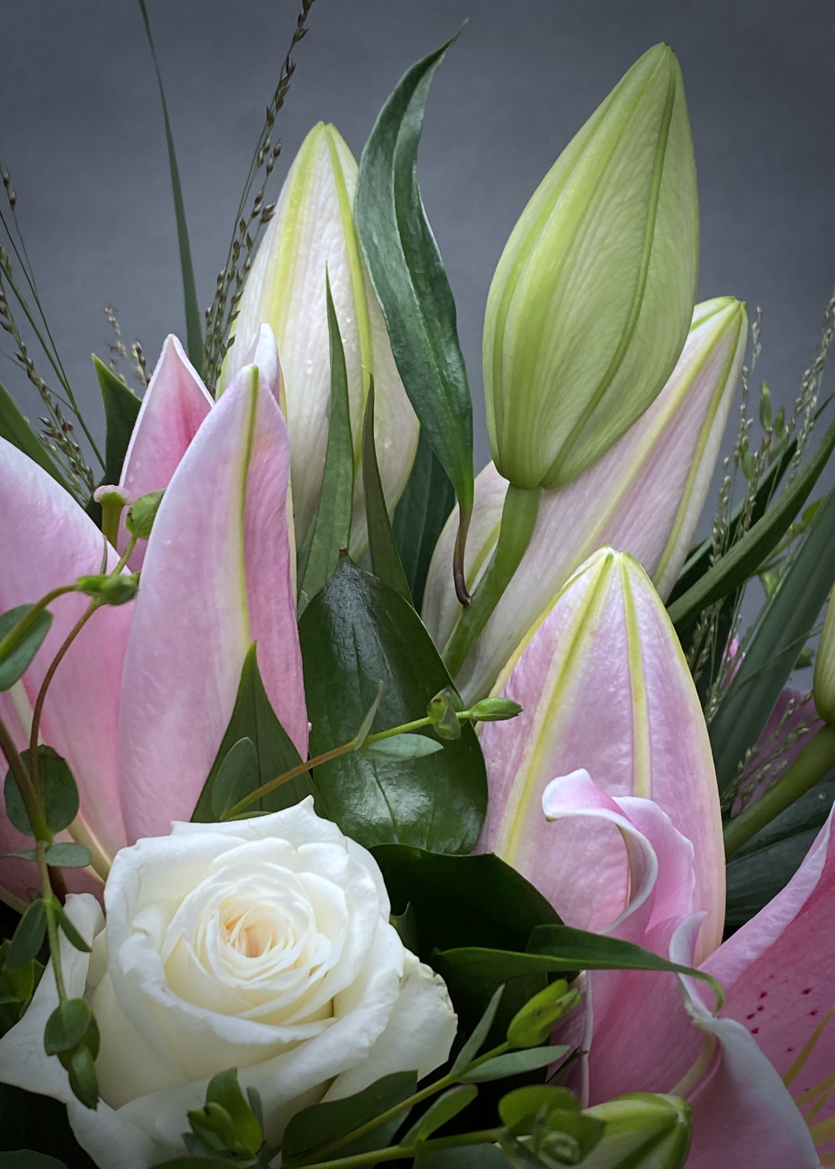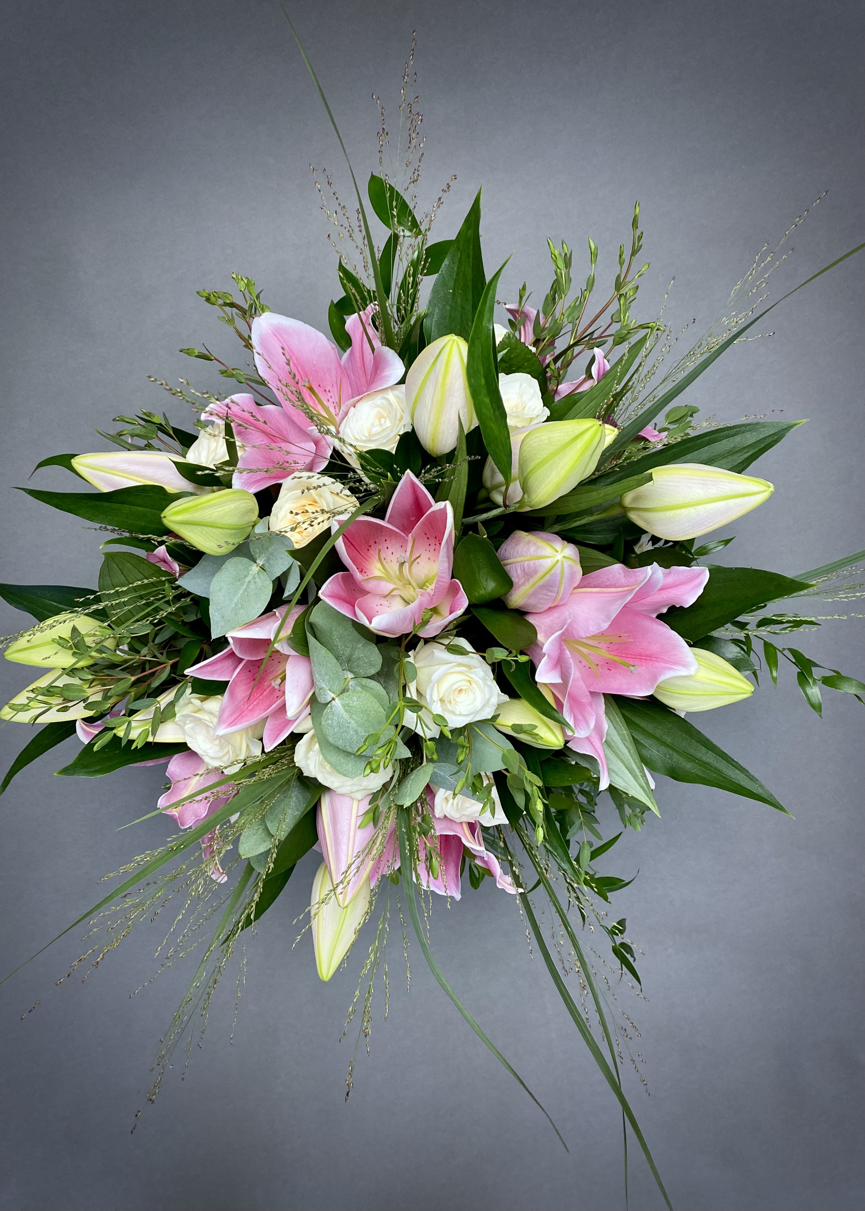A timeless, classic bouquet of pink oriental lily’s, complemented with ivory roses and set amongst a selection of seasonal foliage’s.