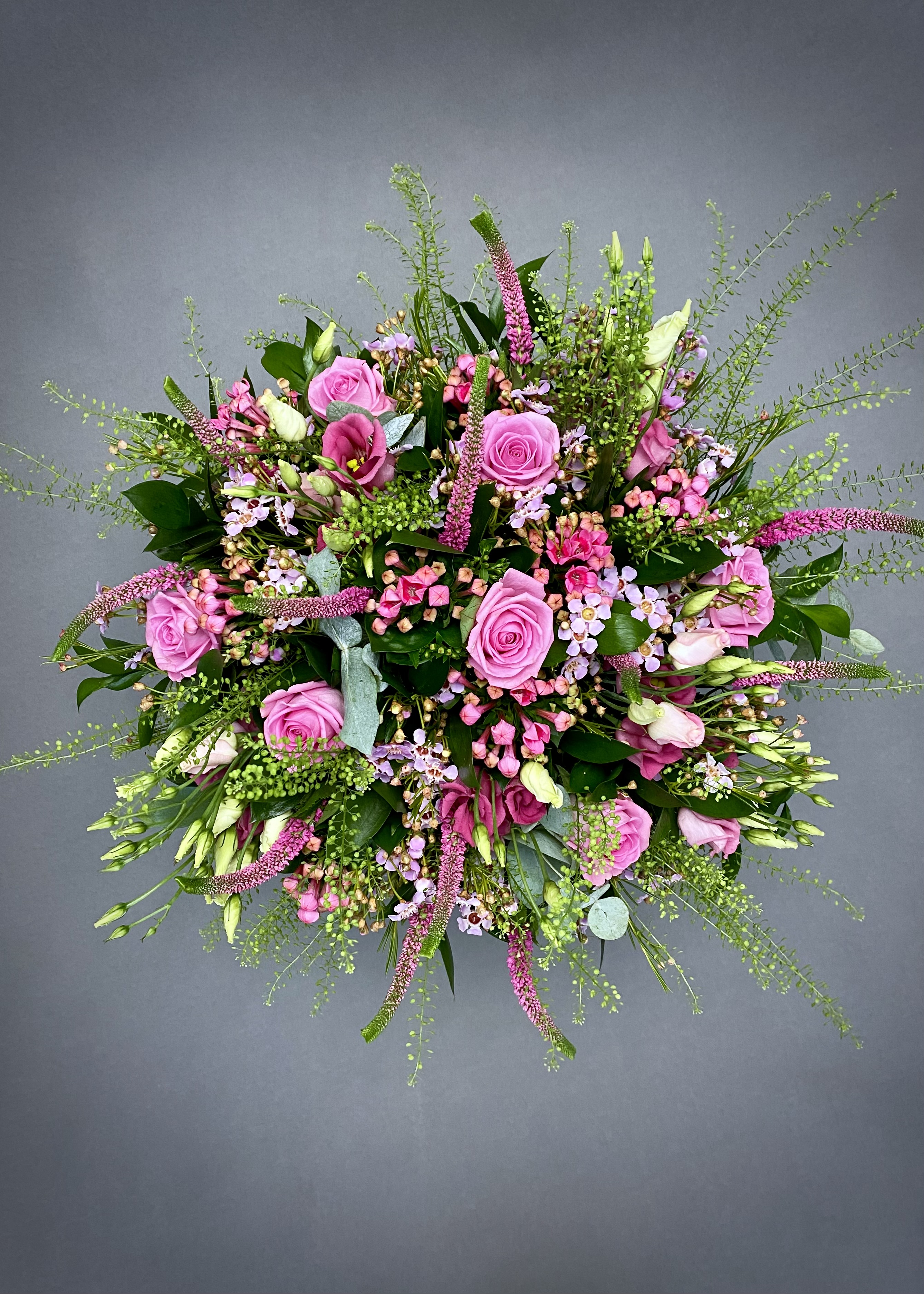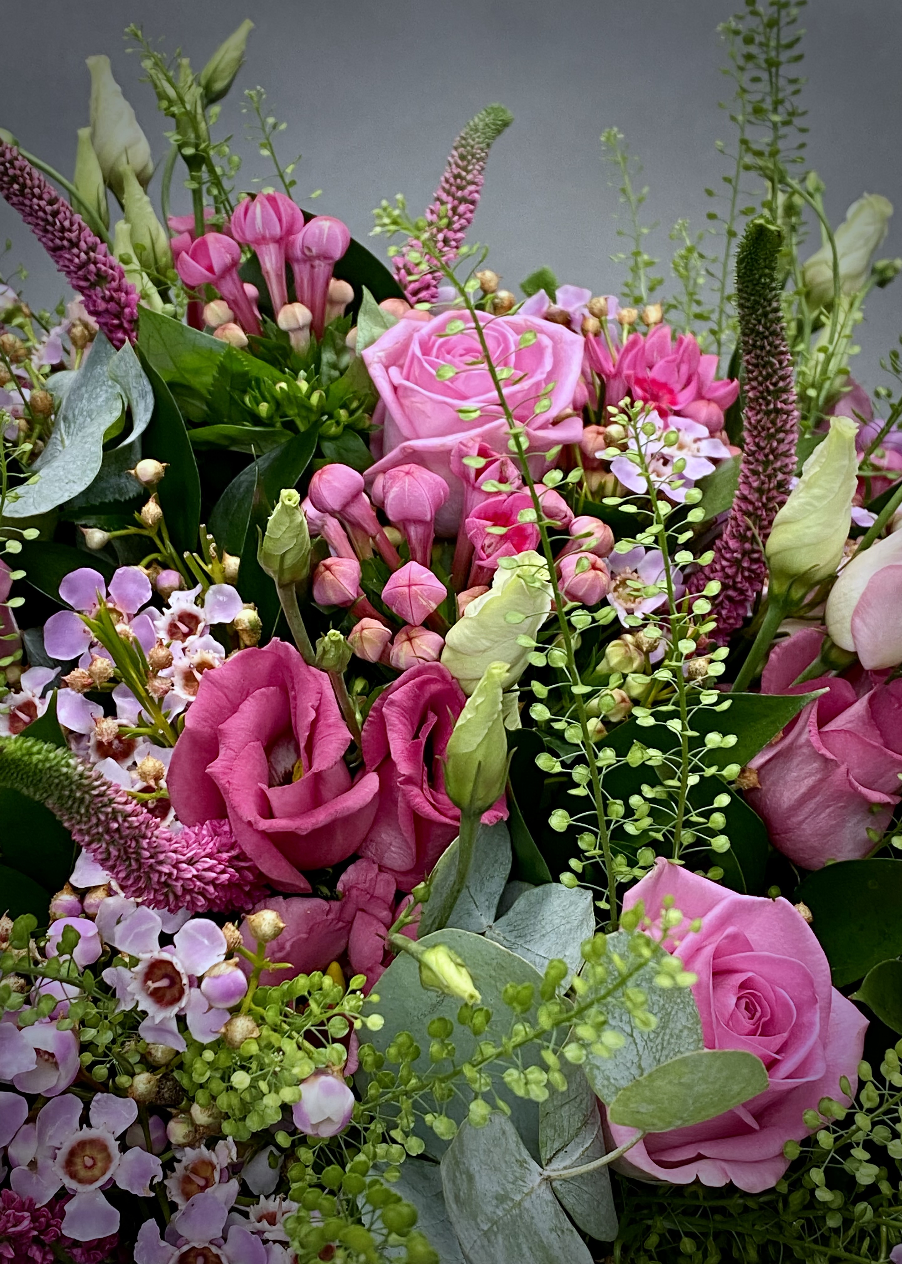 A beautiful bouquet in feminine shades of pink. roses, veroinca, wax flowers, lisianthus all set amongst a selection of seasonal foliage’s.