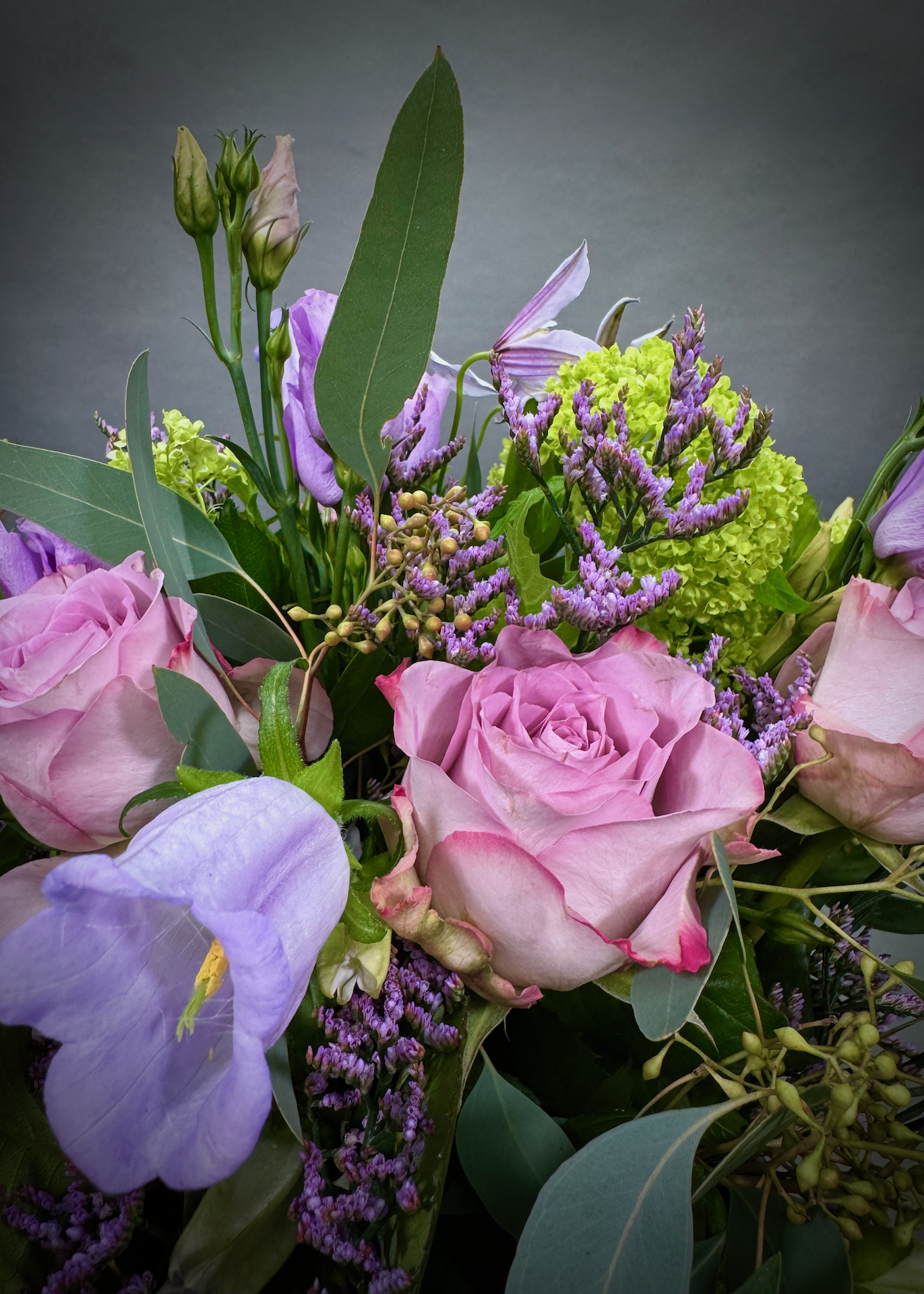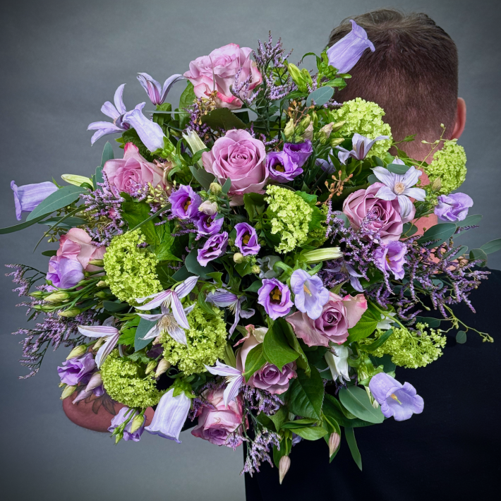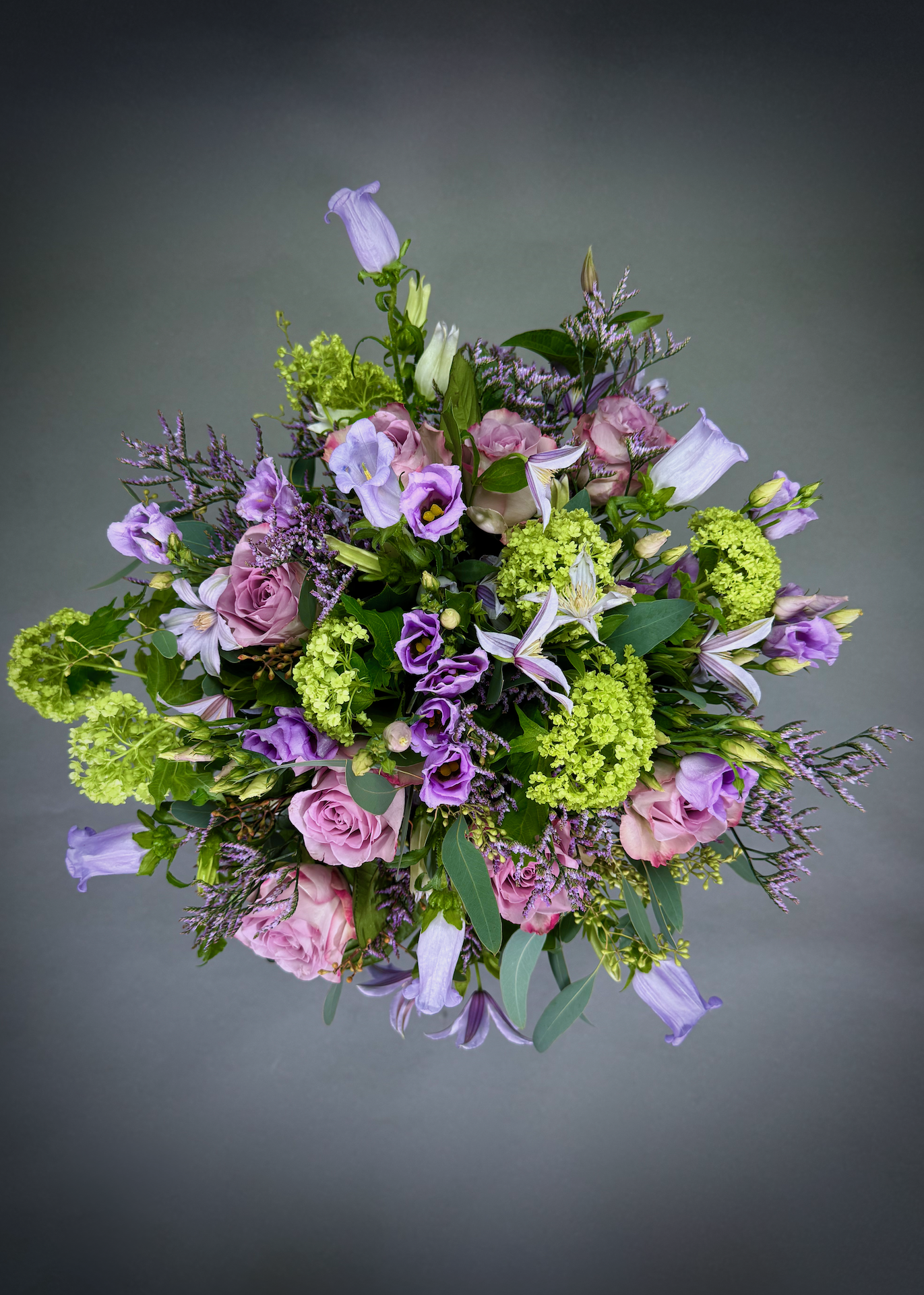 Our Plum bouquet is the perfect mixture of lilac flowers, creating a sense of calm and tranquillity. Memory lane roses, campanula, delicate clematis, eustoma, stocks, limonium with green viburnum mixed with seasonal foliages.
