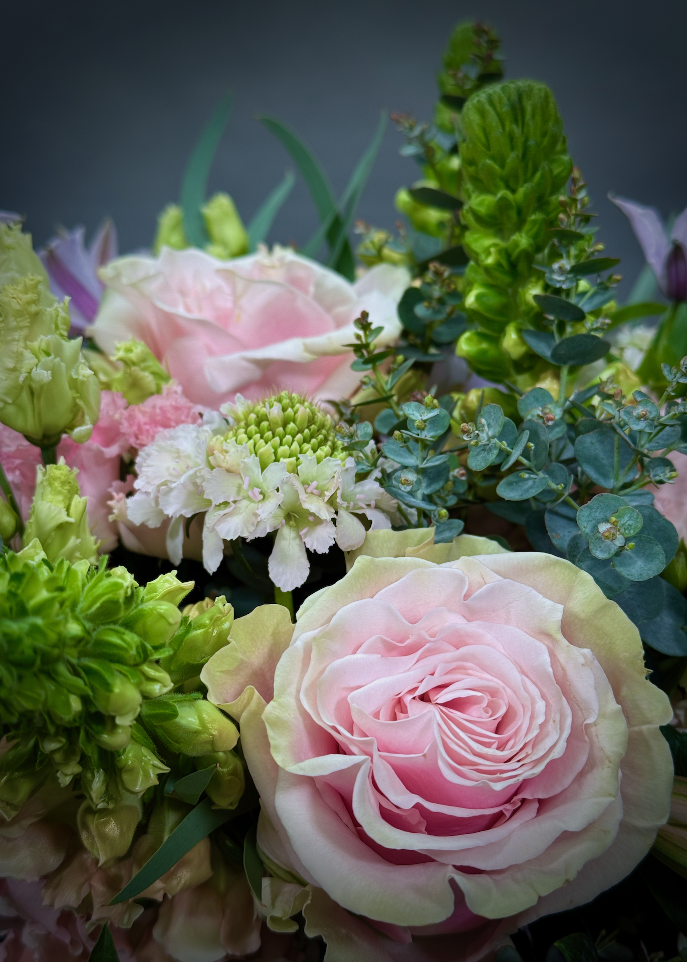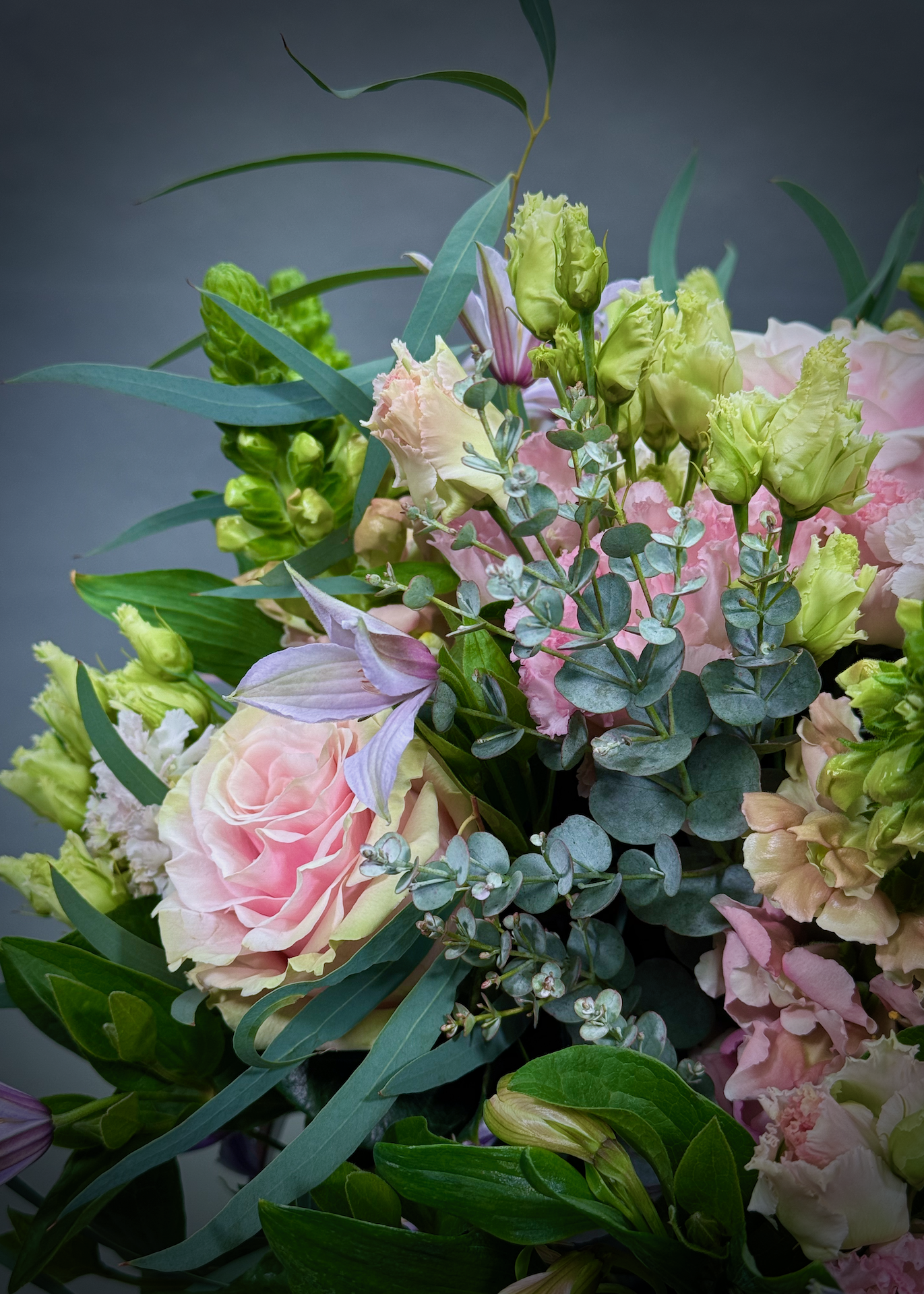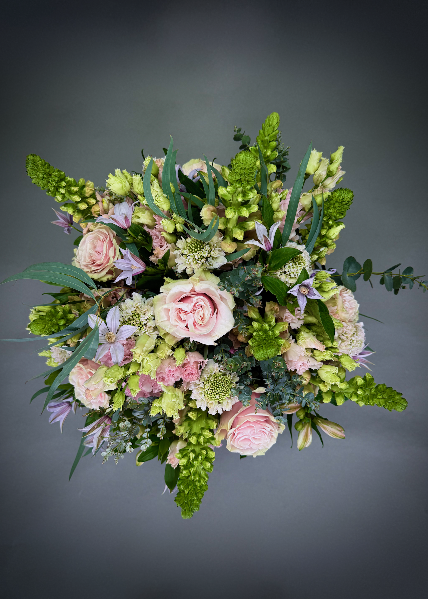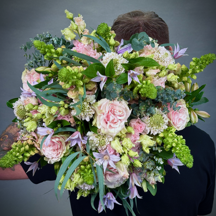 Pastel pink mondial roses, blush pink scabiosa, eustoma, snapdragons, alstroemiera and delicate lilac clematis mixed with soft seasonal foliages create this beautiful bouquet that every recipient will absolutely adore.