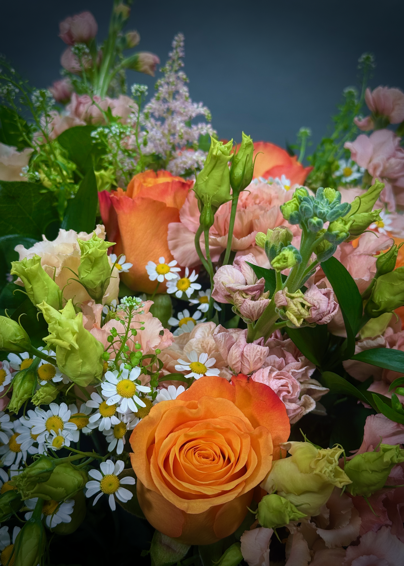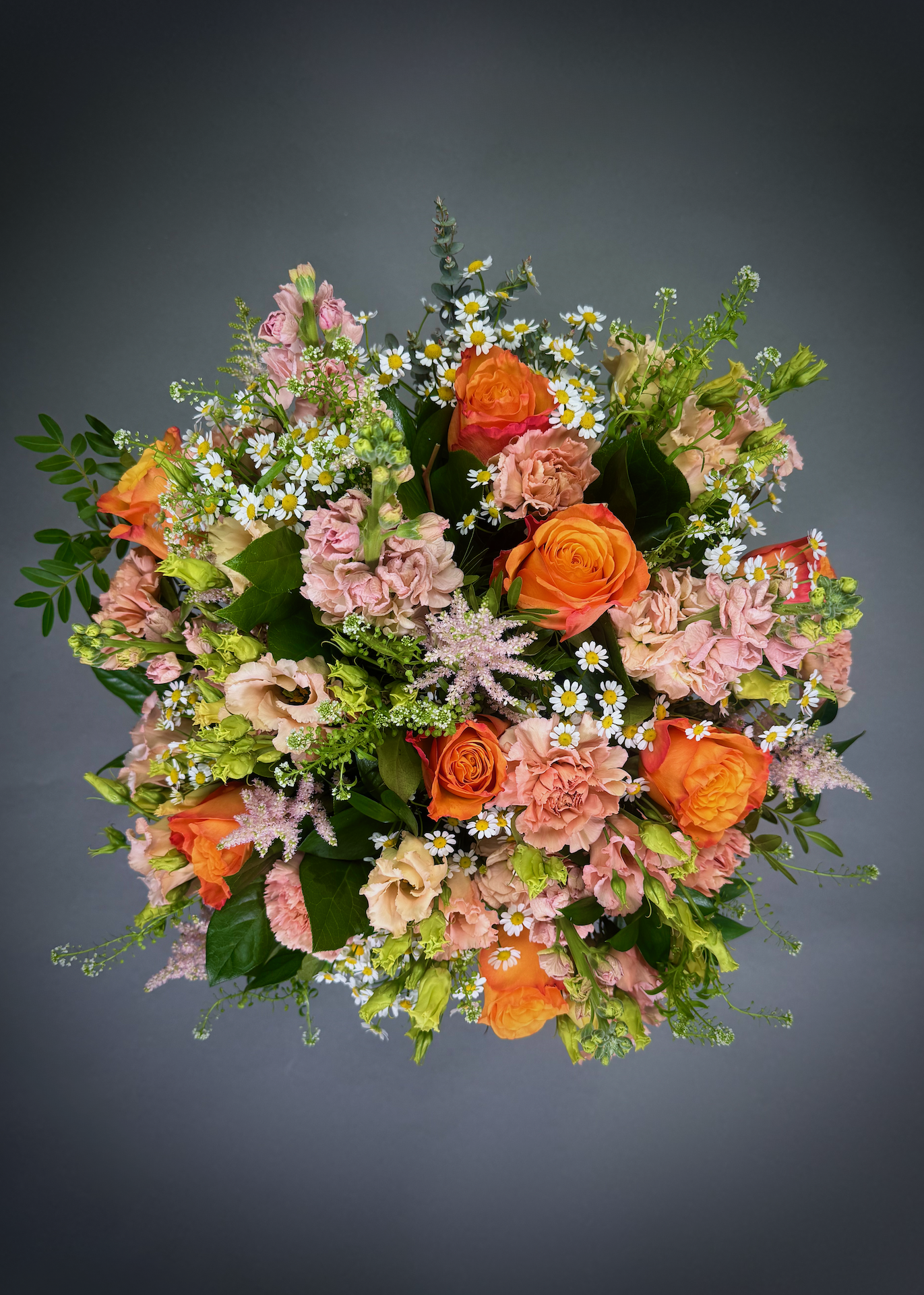 Indulge in the exquisite beauty of our Yew bouquet, Orange rose, peach eustoma, stocks, carnations, blush pink astilbe all nestled among tanacetum daisy mixed with seasonal foliages.
