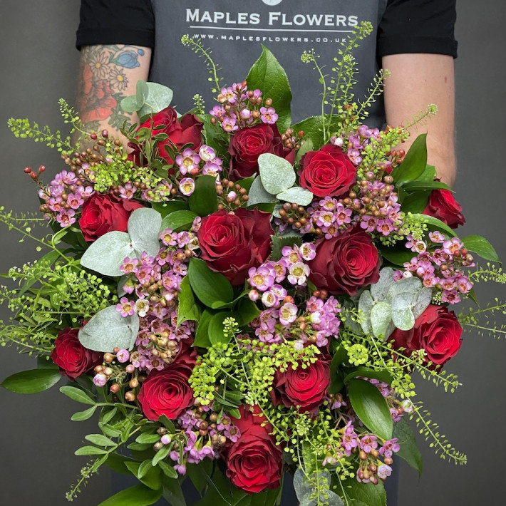 12 beautiful red freedom roses with complimentary pink wax flower and a lovely rich selection of foliages.