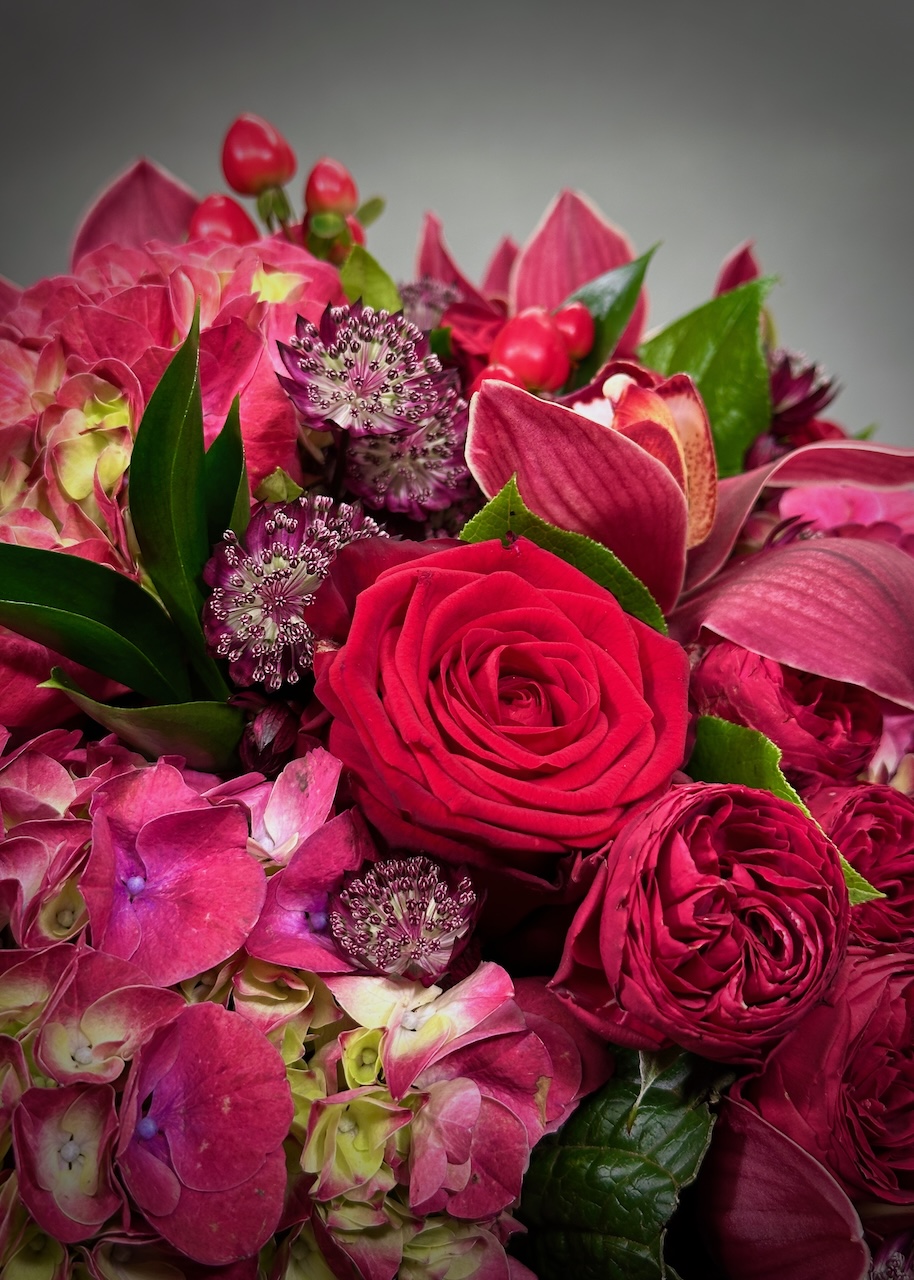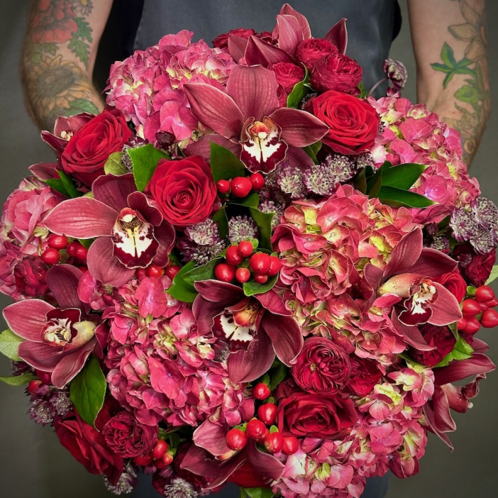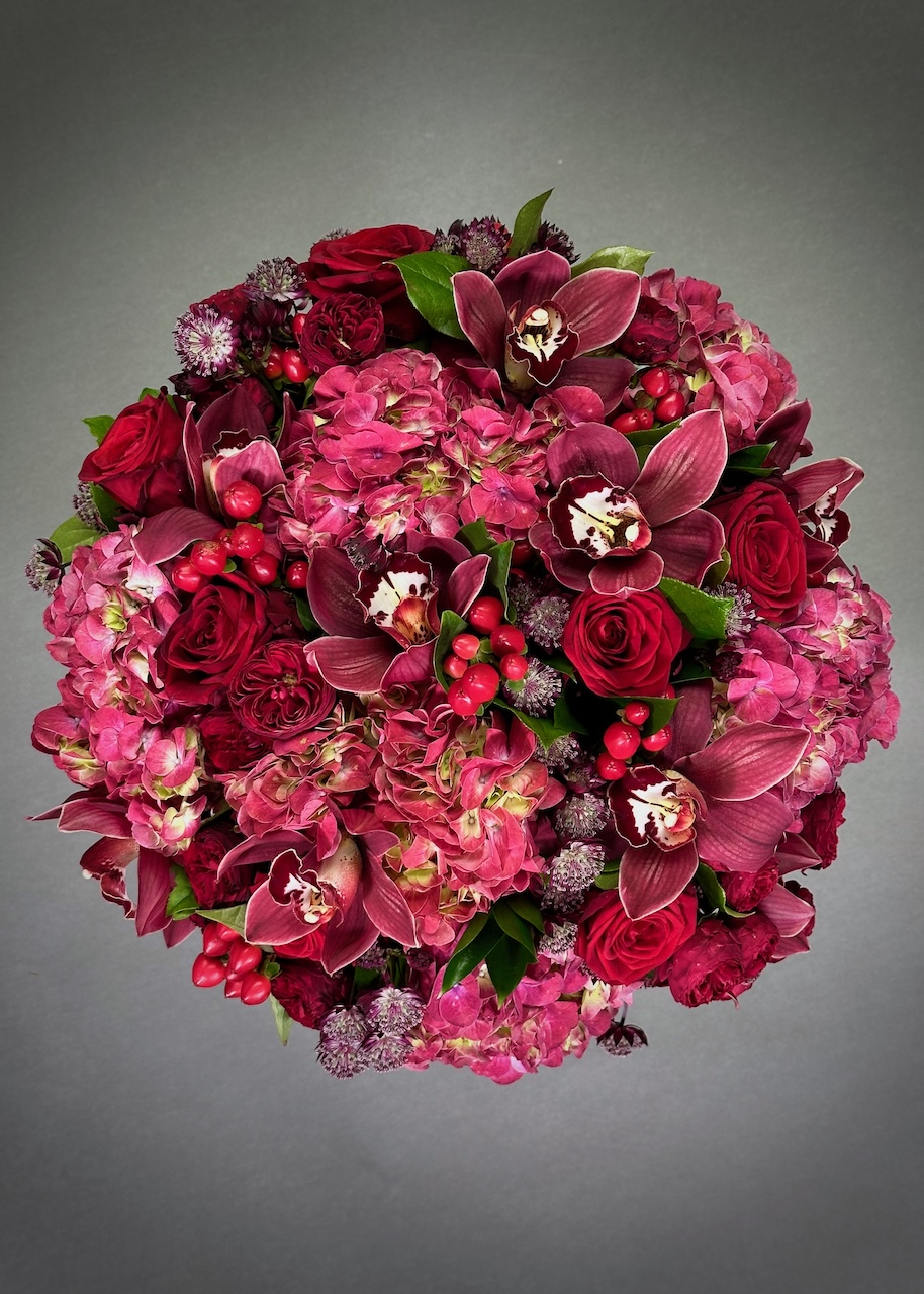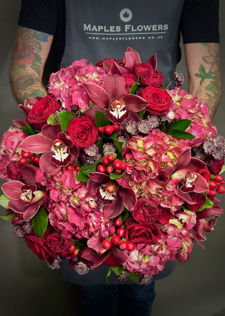 The luxury rich red tones in this bouquet, really do make a statement this valentines day, made with roses, hydrangeas, spray rose, berries, astrantia, cymbidium orchids all set amongst a selection of seasonal foliage’s.