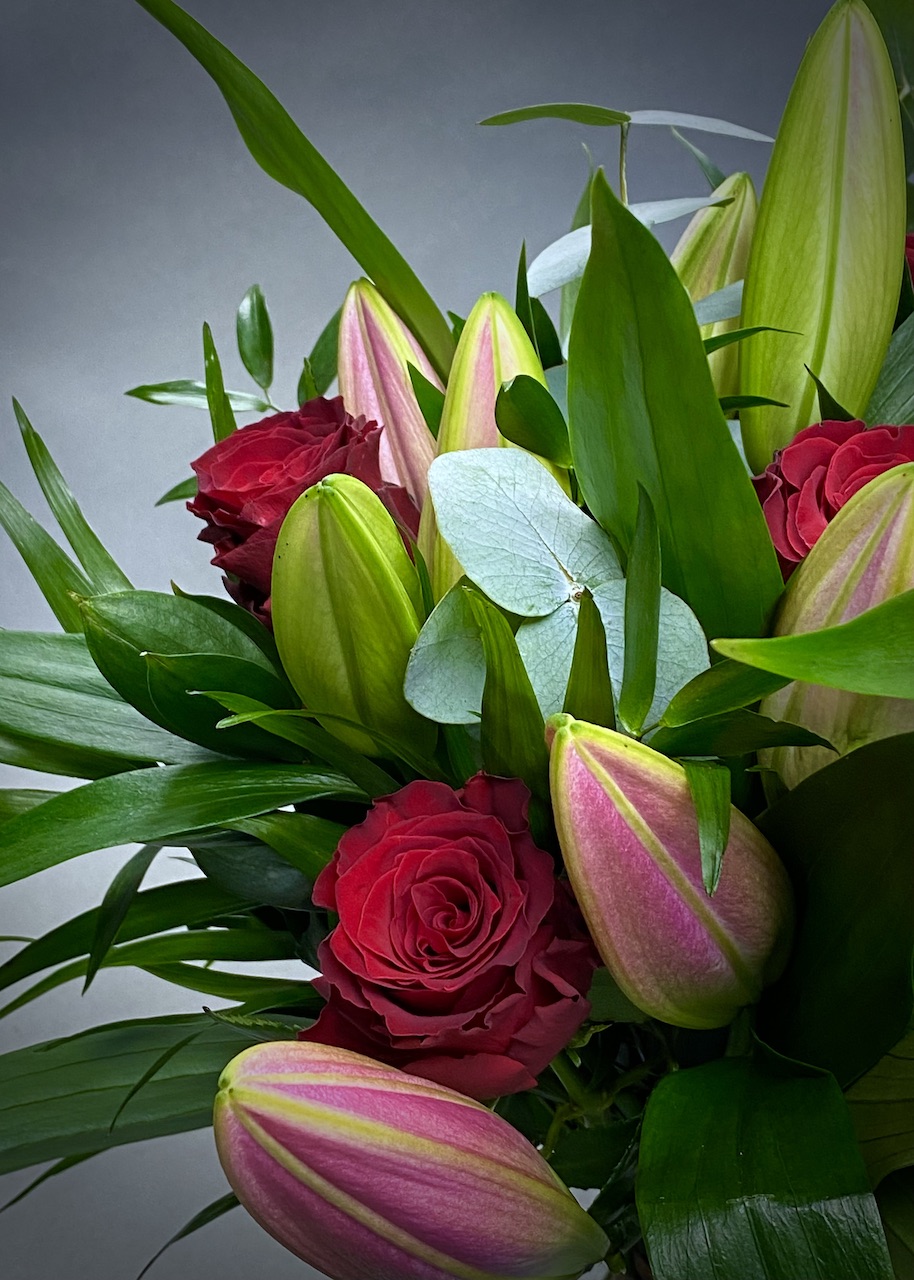 A timeless, classic bouquet of pink oriental lilies, complemented with red freedom roses and set amongst a selection of seasonal foliages. The bouquet pictured is the luxury size.