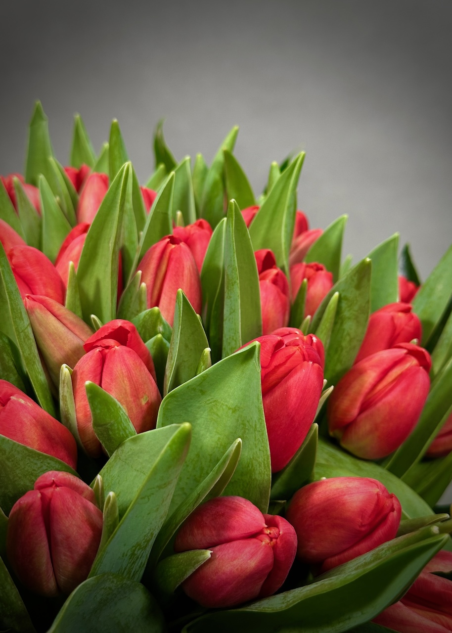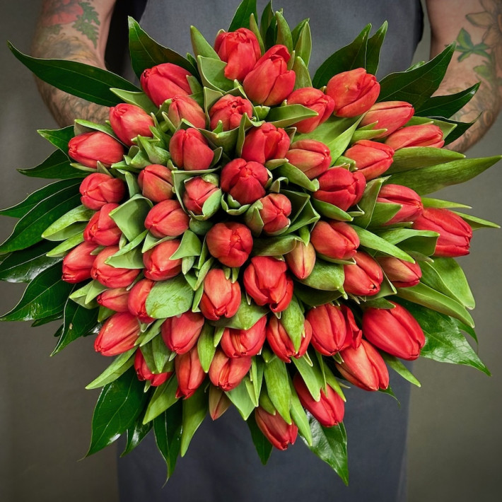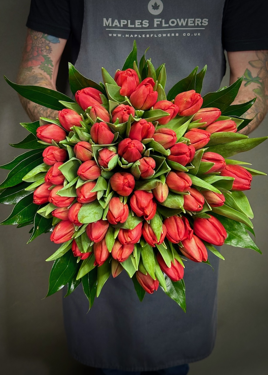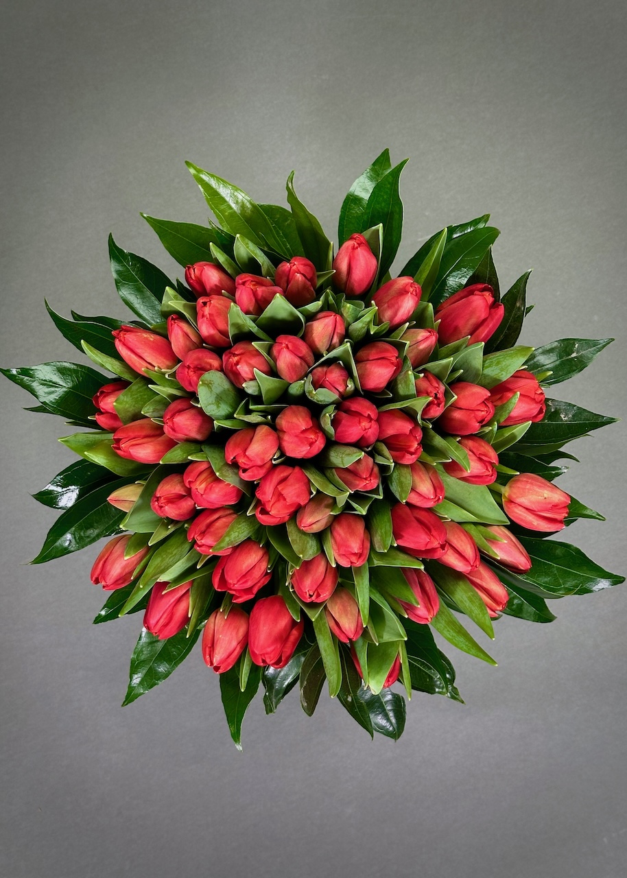 A bouquet of red tulips and framed with foliage, a match made in heaven. The bouquet pictured is 50 tulips
